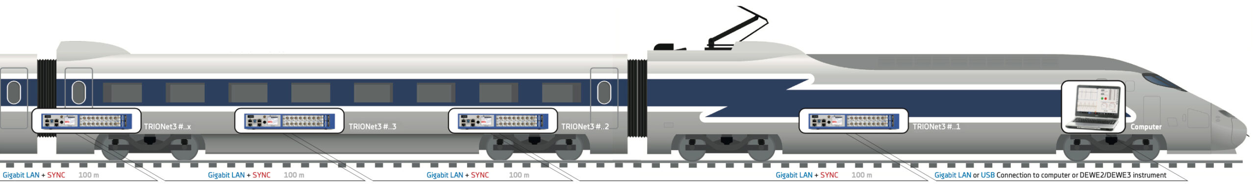 TRIONet3 ist ein sehr kompaktes und flexibles Gerät, optimal für dezentrale Messungen von Strom, Spannung und mechanischen sowie akustischen Parametern. Dadurch eignet es sich für eine breite Palette von Anwendungen. Ein Beispiel ist die Anwendung in Zügen oder anderen Transportmittel zur Messung und Überwachung von elektrischen, thermischen und mechanischen Größen.