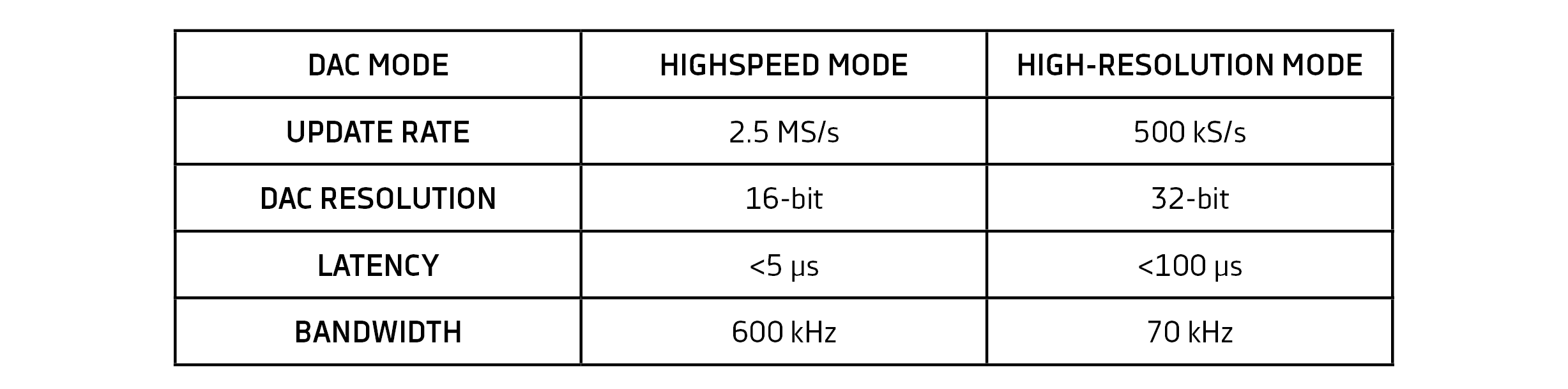The TRION3-AOUT-8 provides two different DAC modes differing in their output rate, resolution and latency. The module can be used in highspeed mode or in high-resolution mode. The following table shows the specifications for each mode: