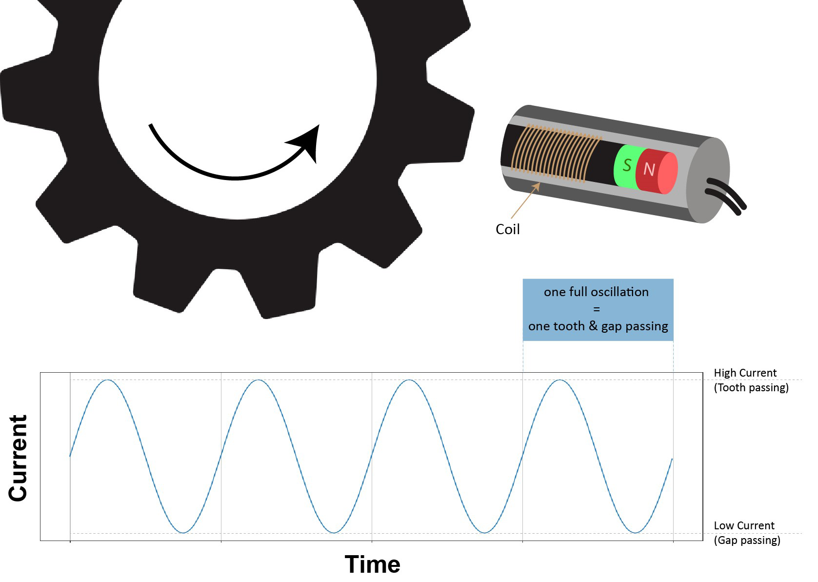 Figure 1 shows a simplified schematic of this process using a ferromagnetic gear wheel. Each time a gear tooth bypasses the sensor, a current is induced and our measurement peaks. By the same token, the measurement is lowest when a gap is passing. Therefore, we obtain an oscillating signal, where a single oscillation represents one tooth and gap passing. Knowing the total number of tooths, it is then possible to calculate the time per revolution and hence also the revolutions per minute (RPM), the frequency, and the angular position.