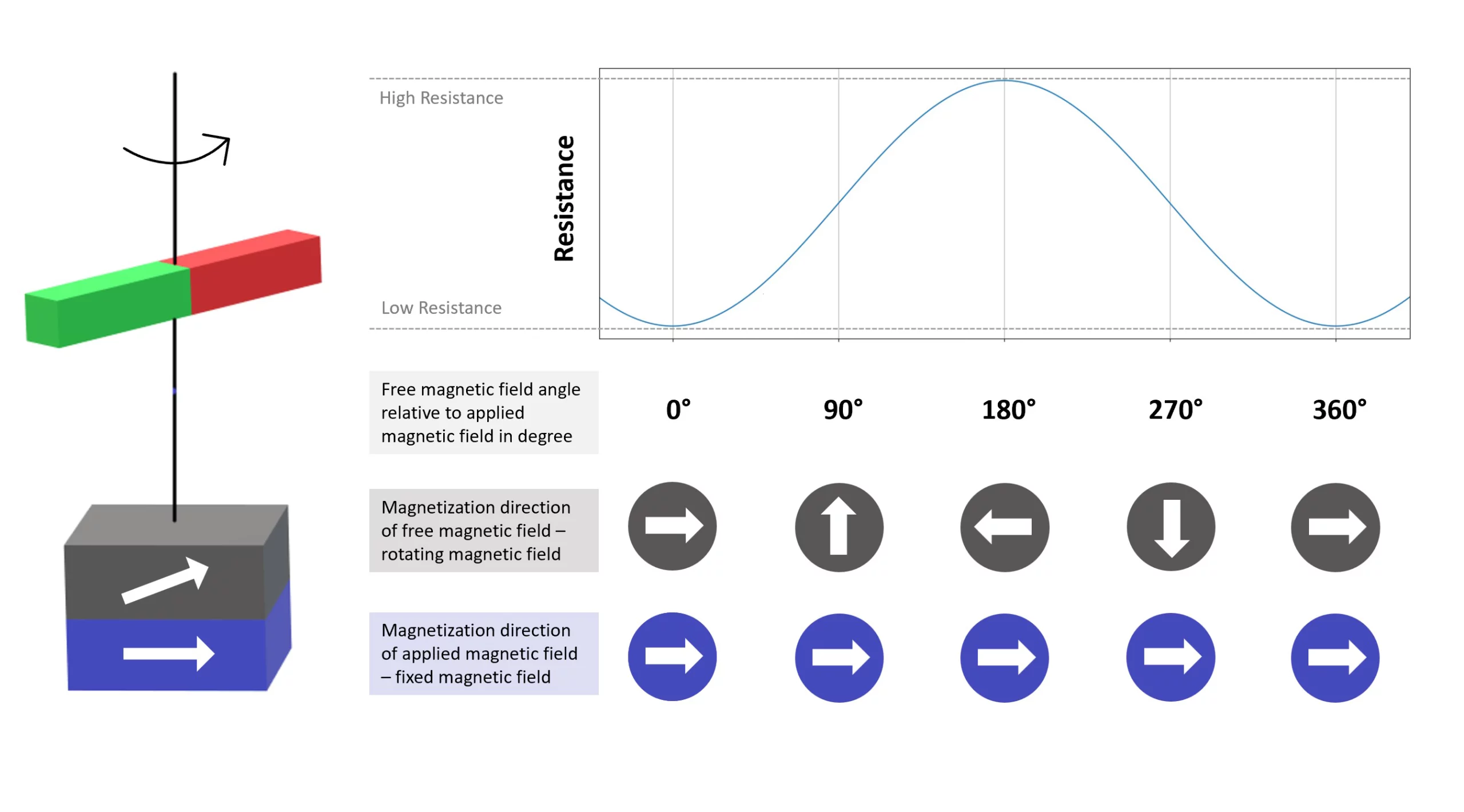 Figure 2: Simplified representation of the operating principles of a TMR sensor. Due to the rotation of the magnet, the resistance of the sensing element changes with the rotation angle.
