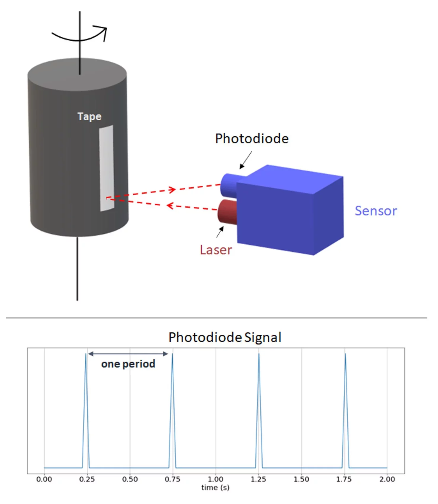 Optical sensors measure the rotation of an object by measuring light which is reflected periodically from the object itself. For this purpose, an infrared (IR) laser usually sends light onto the spinning object. The object itself is marked with an adhesive tape or another similar reflective material which reflects the incident beam back to the sensor. To measure the reflected light, a photodiode is typically used to convert the absorbed light into measurable current. Every peak in the light intensity due to reflection, is paralleled by a peak in the electrical signal and thus allows to determine the frequency, period, rotational speed, and angular position.
