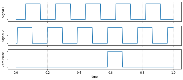 Figure 4: Converted square-wave signals obtain from two slightly shifted sensors plus zero pulse. These measurements include everything needed for an absolute determination of position.