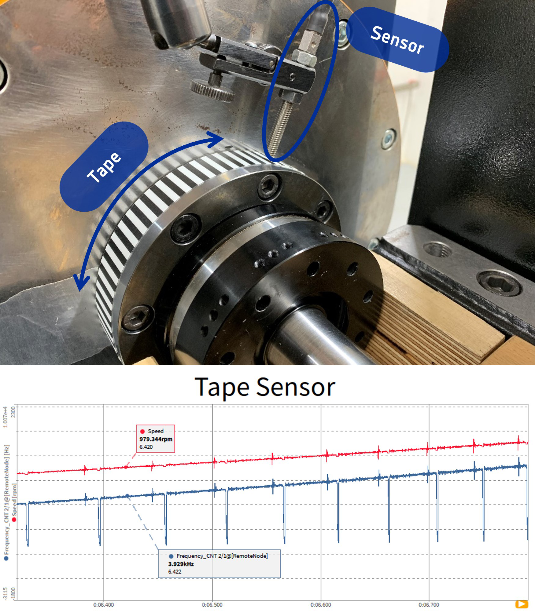 Figure 5: Practical implementation of the DEWETRON Tape Sensor. The upper image shows the mounted sensor plus the reflective black and white tape attached to the rotating wheel. The lower image displays the measured and processed data via OXYGEN – DEWETRON’s intuitive measurement software.