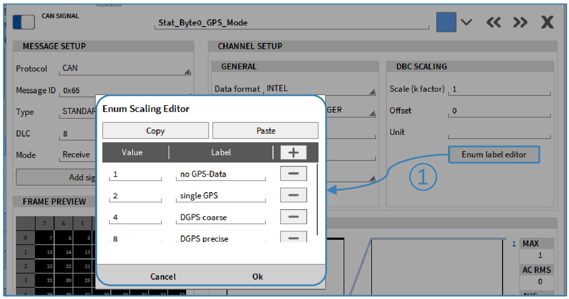 Decoding of enum values is now also possible. Enums are a special data type that can only accept a finite, predefined number of values. OXYGEN 6.1 can now convert numeric data into text by means of enum scaling. Thereby, OXYGEN supports CAN, IMU, Flexray and Ethernet channels. You can define the labels of the individual enum values in the enum label editor.