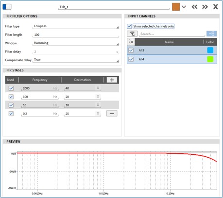 With OXYGEN 6.3 you also have the possibility to compensate the sometimes very high latency of FIR filters automatically. There is also the possibility to create multiple filter stages for all FIR filters. For the lowpass filter there is also the option to set a decimation, i.e. integer reduction of the output frequency.