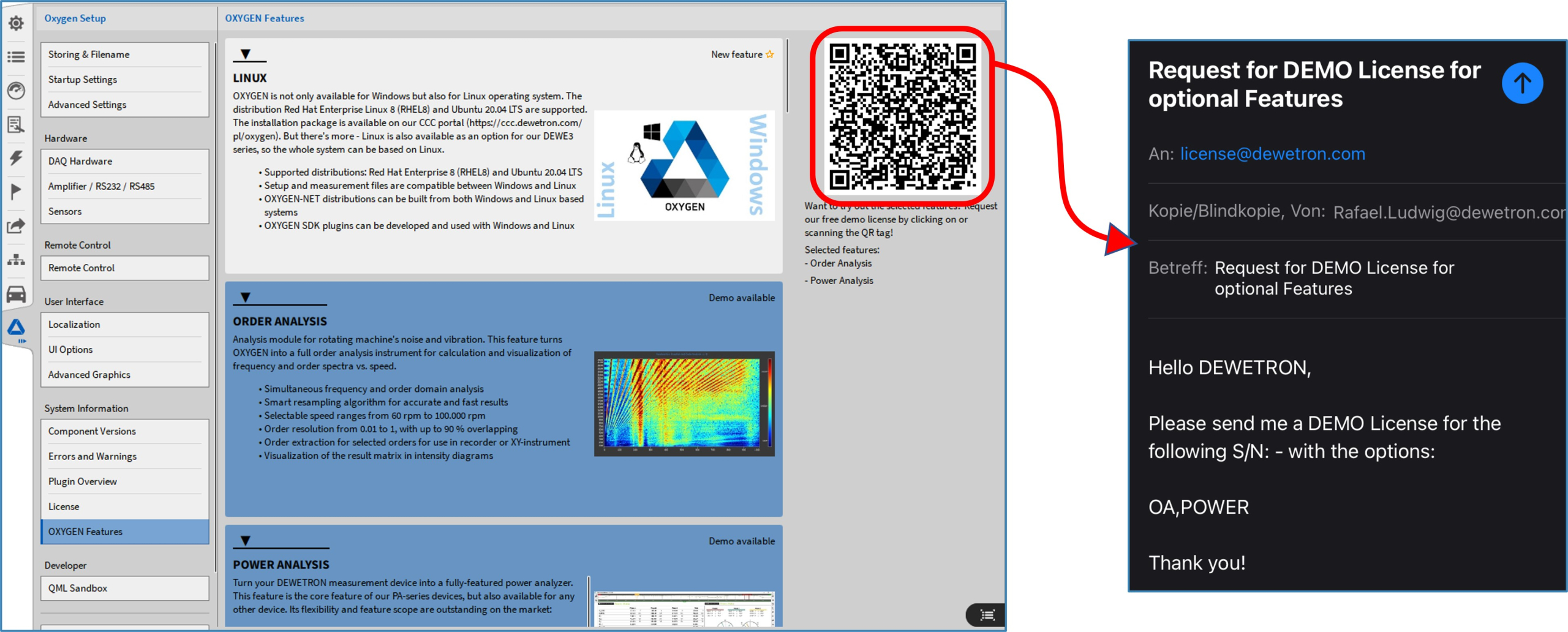 You want to test different existing and new OXYGEN features with your existing OXYGEN 6.3 software? No problem, with the new feature promotion you can select up to 5 OXYGEN features and request a demo license for 30 days via the QR code shown and try out the features on your system at your leisure for this time.