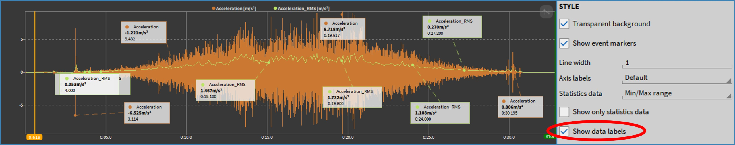Our new OXYGEN 6.3 software allows you to add labels to a recorder on the measurement screen at positions of your choice in the signal. The added labels include the name of the signal, the current value and a timestamp. You can easily hide added labels in the settings and display them again. Thus, you can now mark important events in the signal and display the previously mentioned information.