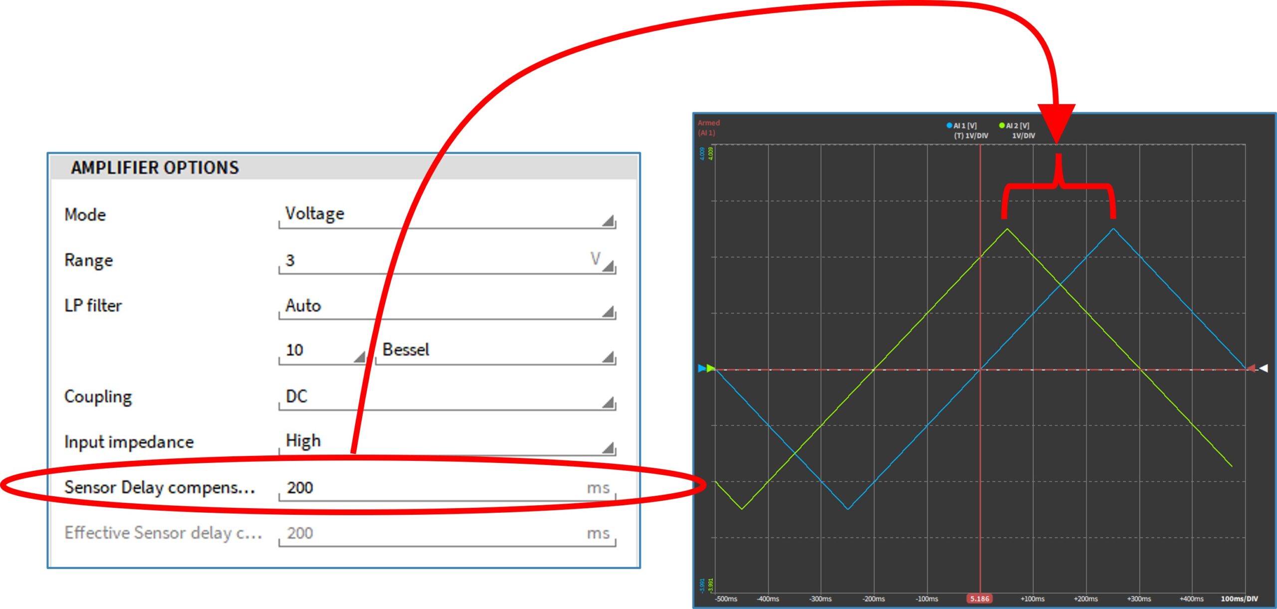 The new function in OXYGEN 6.3 to compensate a known sensor delay, offers you the possibility to specify a sensor delay between 0 and 500ms for analog inputs to compensate the delay of the input signal.