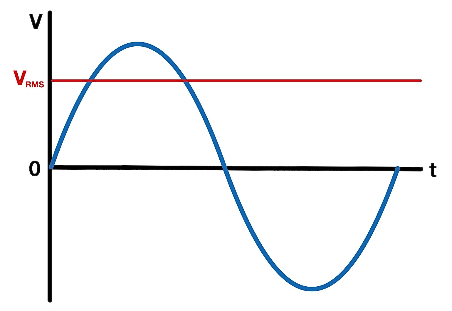 If a parameter does not explicitly indicate whether it is a peak value, peak-to-peak value, instantaneous value, or similar, it almost always refers to the effective value. However, to refer explicitly to the effective value, one uses the designation VRMS or Veff. RMS stands for Root-Mean-Square. This abbreviation indicates how one can calculate the effective value: Square the instantaneous value, then average over it and finally take the root.