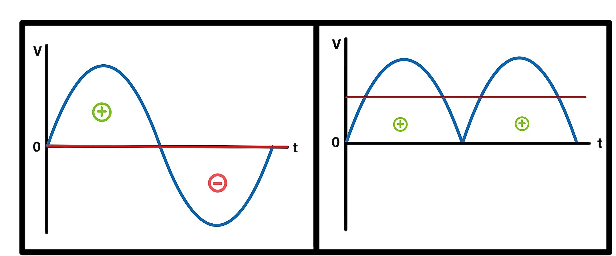 In practice, the direct value is rarely used since it has the same value (zero) for all AC signals. Therefore, for alternating signals one defines the average value in another way, called rectified value. The rectified value is not simply the average over the signal, but the average over the absolute signal. Absolute means that a negative value like -5 V gets converted to a positive value like +5 V. Thus, there are no more negative values.