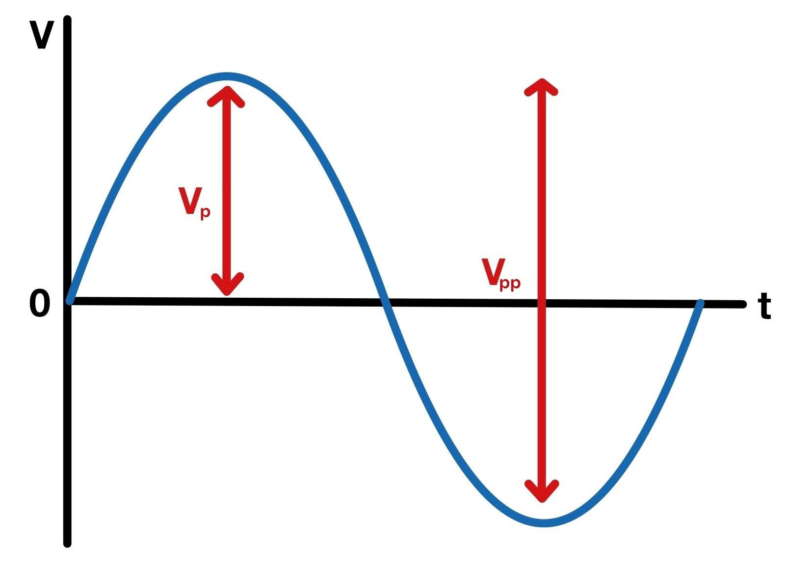 In order to characterize AC voltages more precisely, other parameters are used in addition to the instantaneous value. These parameters include the peak and peak-to-peak value. To indicate these one adds a subscript character to the quantity like Vp or Vpp.