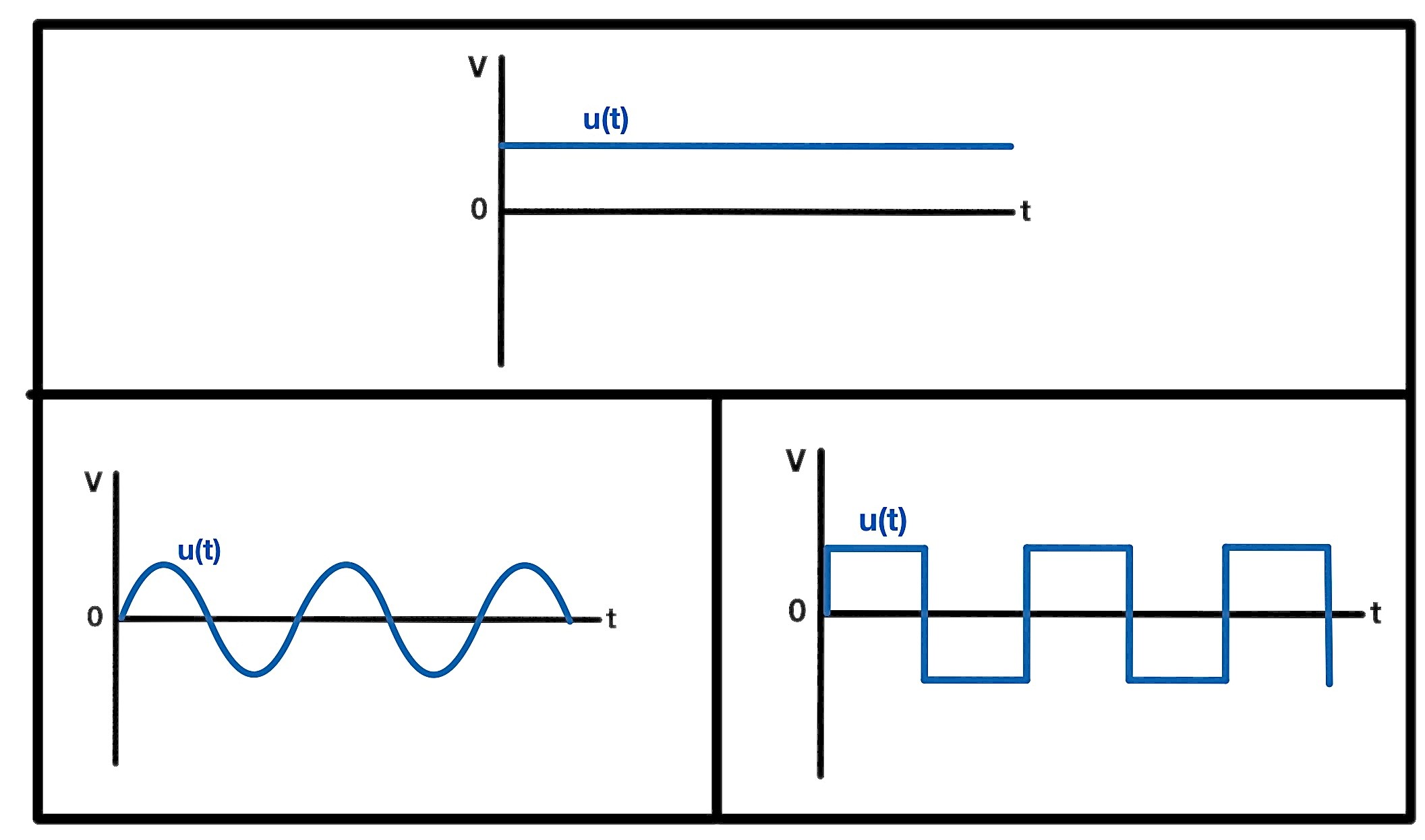 In contrast, the instantaneous value of an AC voltage changes continuously. In this case, the time course of the instantaneous value represents a periodic signal. This periodic signal can e.g. be a sine wave but may also be a square wave signal.