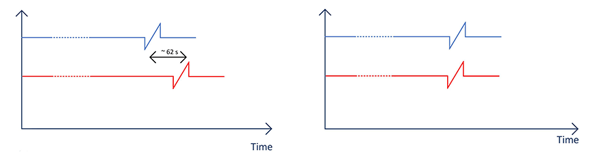 The following figure shows the comparison. The left figure shows the time drift without synchronization. The right figure the time base without timing error (right).
