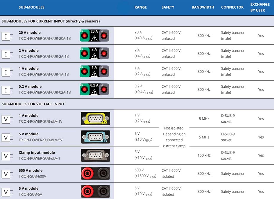 The TRION sub-modules are the core of our TRION3-1810-SUB-8 measurement board. We offer a wide range of sub-modules for DC or voltage measurement. Thus, almost any kind of voltage and current sensor can be connected to our modules. In addition, each of the sub-modules is user-replaceable. Sub-modules are recognized automatically, and calibration data is stored directly in the sub-module.